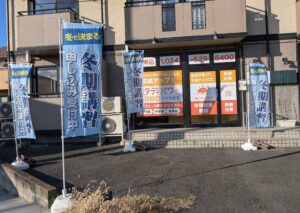 そこで、先日、塾前の「4本ののぼり」を「冬期講習申し込み受付中」に変更しました。